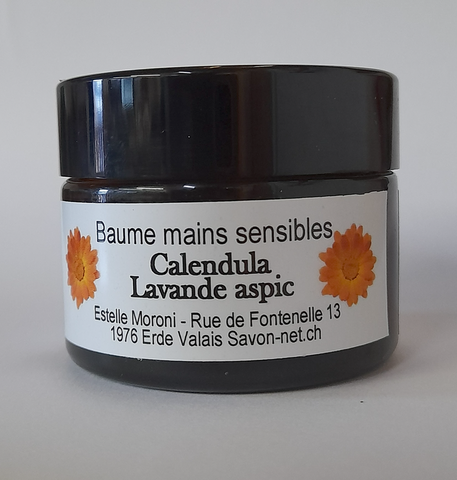 Ingrédients : Macérât calendula BIO (tournesol BIO), beurre de karité BIO, beurre de cacao BIO, cire d’abeille, Vitamine E, HE lavande aspic BIO (linalol, limonène. Naturellement présents dans les huiles essentielles)